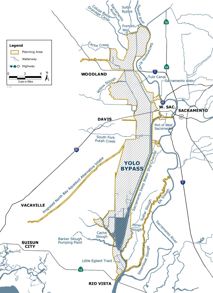 The planning area for the Yolo Bypass Cache Slough (YBCS) Master Plan primarily covers the Yolo Bypass and Cache Slough regions.